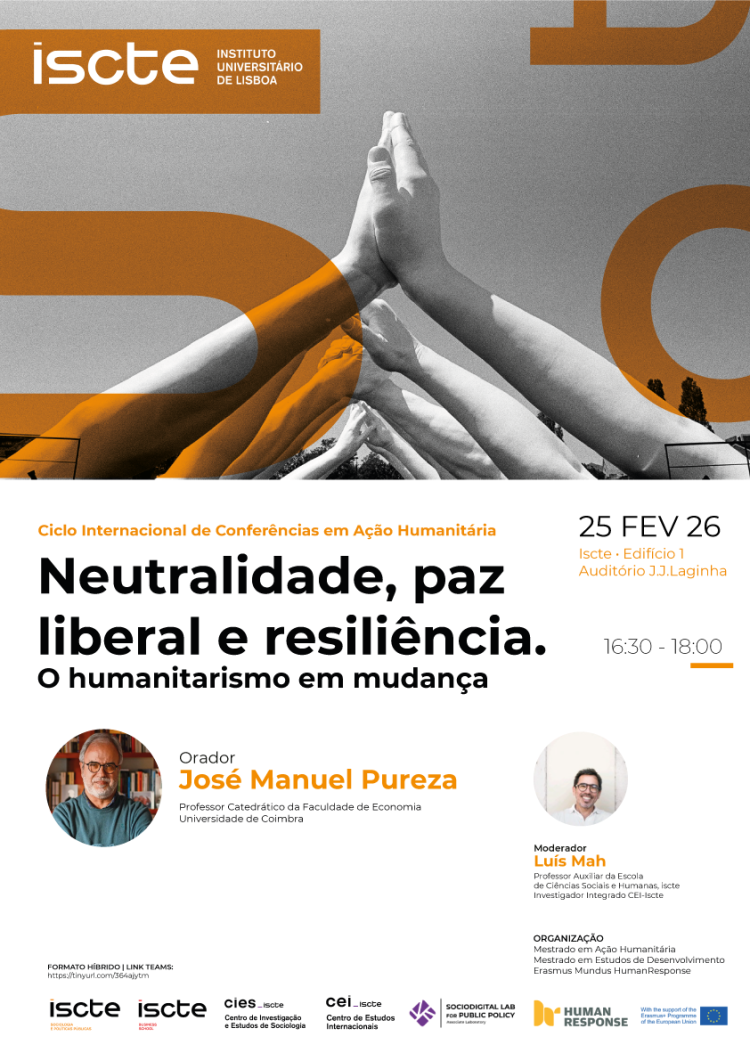 The International Conference Cycle on Humanitarian Action is coordinated by Professor Paulo Pedroso (Visiting Assistant Professor at the Department of Sociology and Public Policy of the School of Sociology and Public Policy and Associate Researcher at CIES-Iscte) and organised jointly by the Master’s in Humanitarian Action, the Master’s in Development Studies, Erasmus Mundus Human Response, and the School of Sociology and Public Policy, Iscte Business School, CIES-Iscte, CEI-Iscte, and SOCODIGITAL_LAB.
